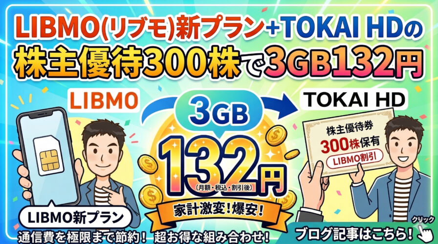 LIBMO(リブモ)新プラン+TOKAI HDの株主優待300株で3GB 132円に!